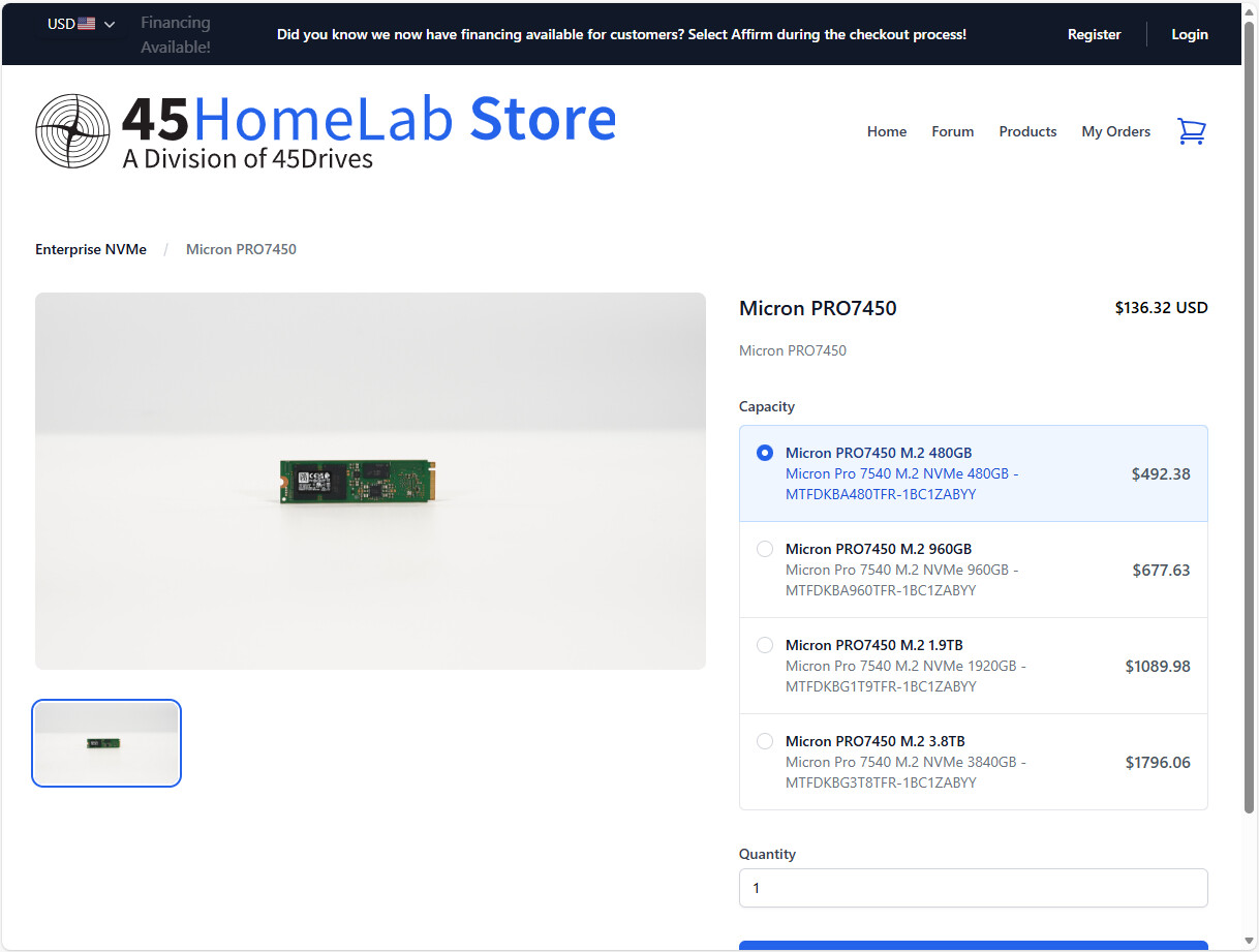 FYI @Vikram-45HomeLab - I was shopping on the 45HomeLab Store today and I noticed the starting price of the Micron PRO7450 doesn’t match the cheapest option available on the next page. It’s a pretty big jump from $136 to $492. ![]()