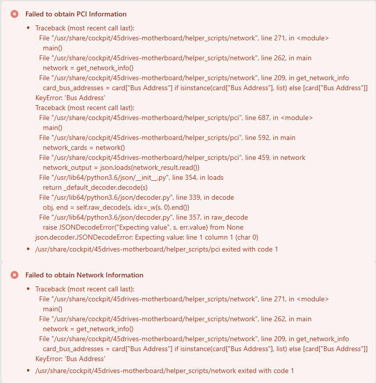 I suspect the errors are due to a the motherboard in the HL15 2.0 not being supported yet with the version installed. The repo at GitHub - 45Drives/cockpit-hardware: A cockpit module for 45Drives storage servers was updated a month ago to support the HL15 2.0 motherboard, but I don’t see a new release with an updated package file. I believe that has to happen before you’ll be be able to update your packages via dnf.