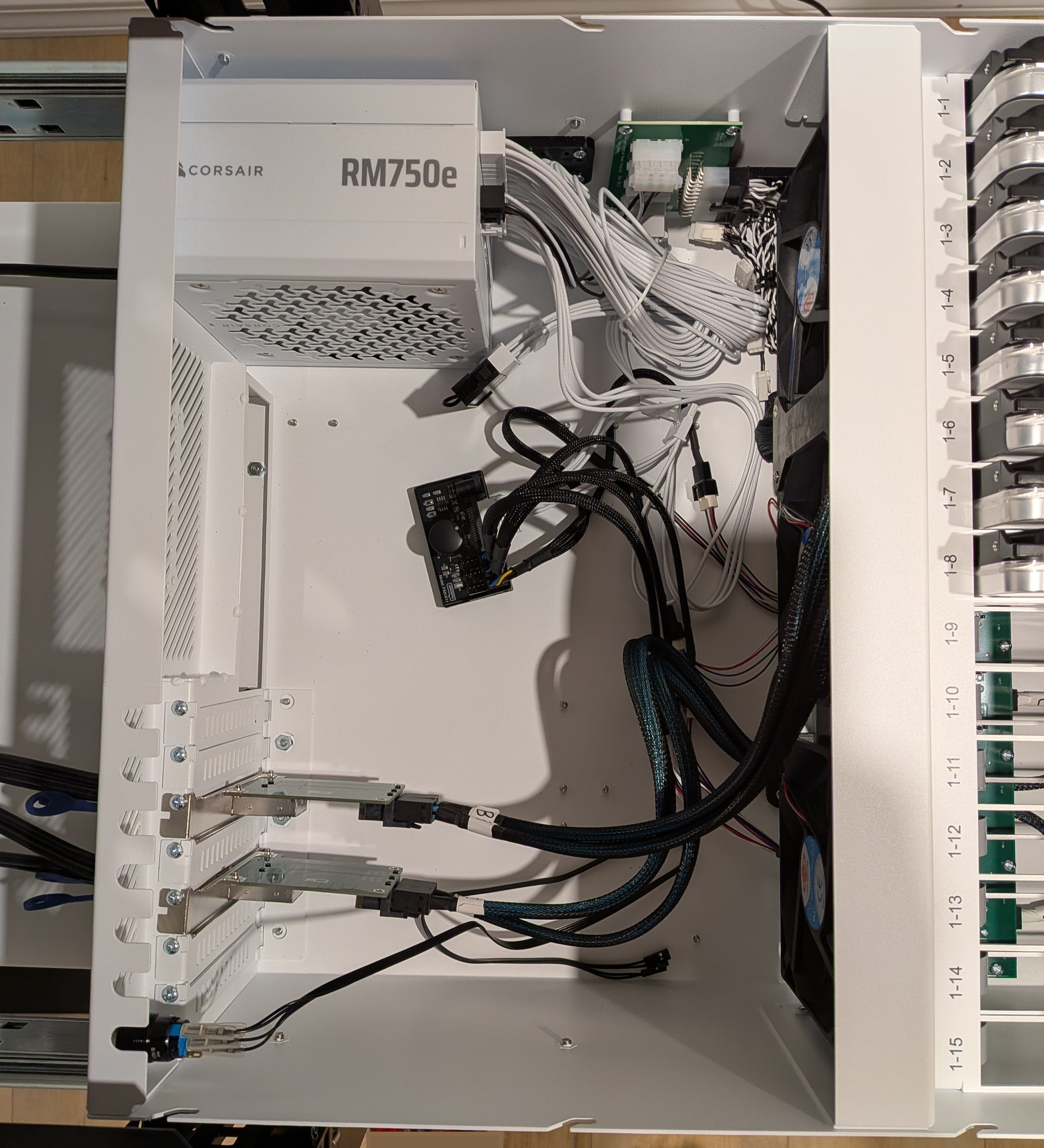 I plugged the ATX jumper into the 24-pin from the PSU, the fans into the fan speed controller along with a SATA connector for power, installed the two SFF-8643/8644 adapters in the PCIe slots and connected them to the backplane cables, and I think that was it. It just turns on via the PSU switch; the case power switch/LED isn’t connected and there’s nothing fancy to trigger powering it on and off concurrently with the main HL15.