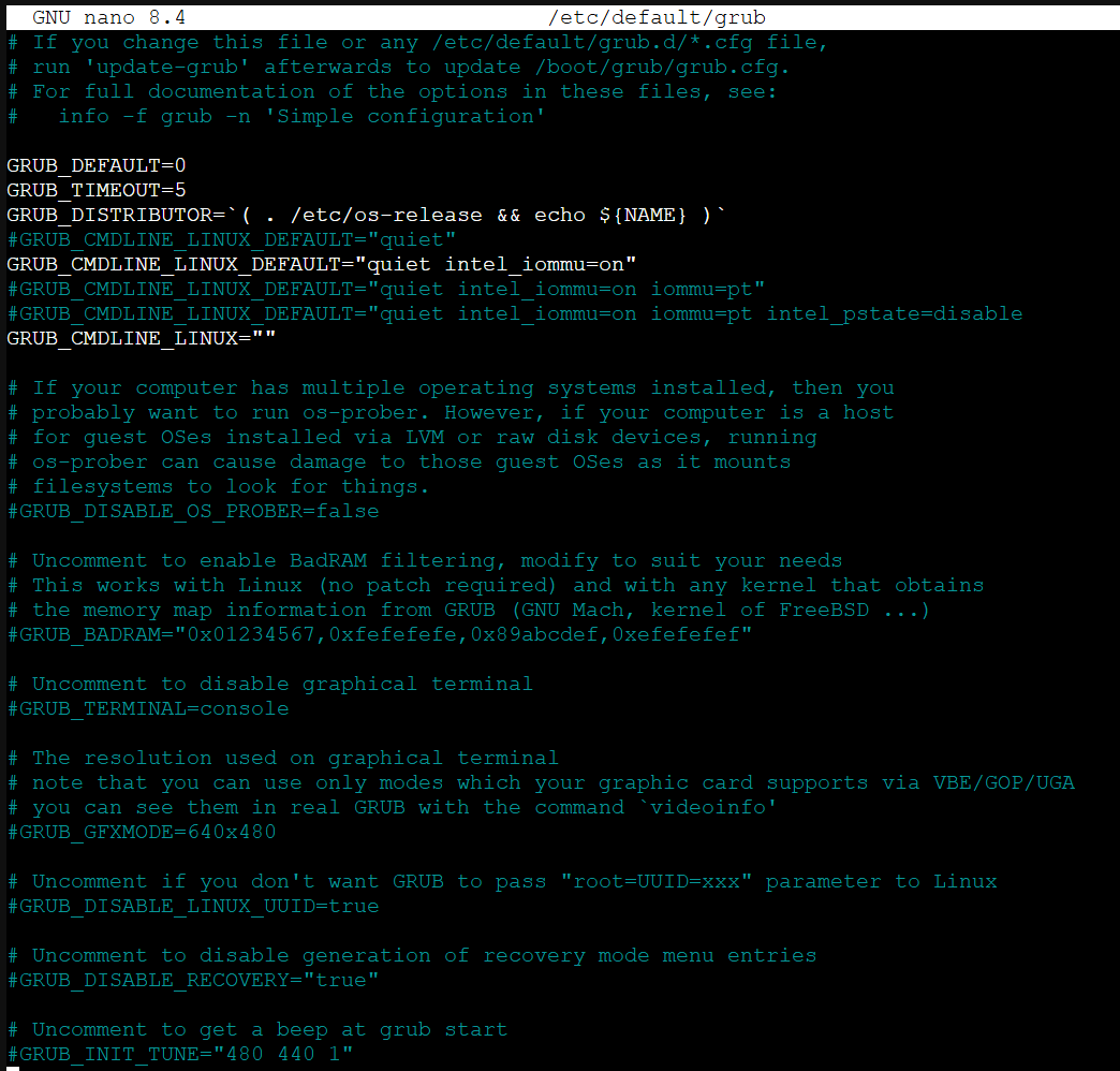 You see “intel_iommu=on” is in there as well as 2 Lines commented out with “iommu=pt” and “intel_pstate=disable”.