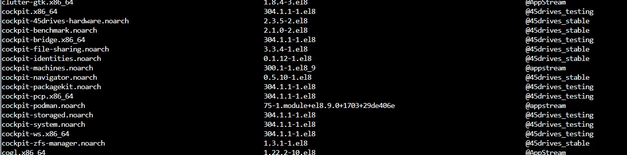 sudo dnf update cockpit-file-sharing cockpit-navigator cockpit-benchmark 45drives-tools