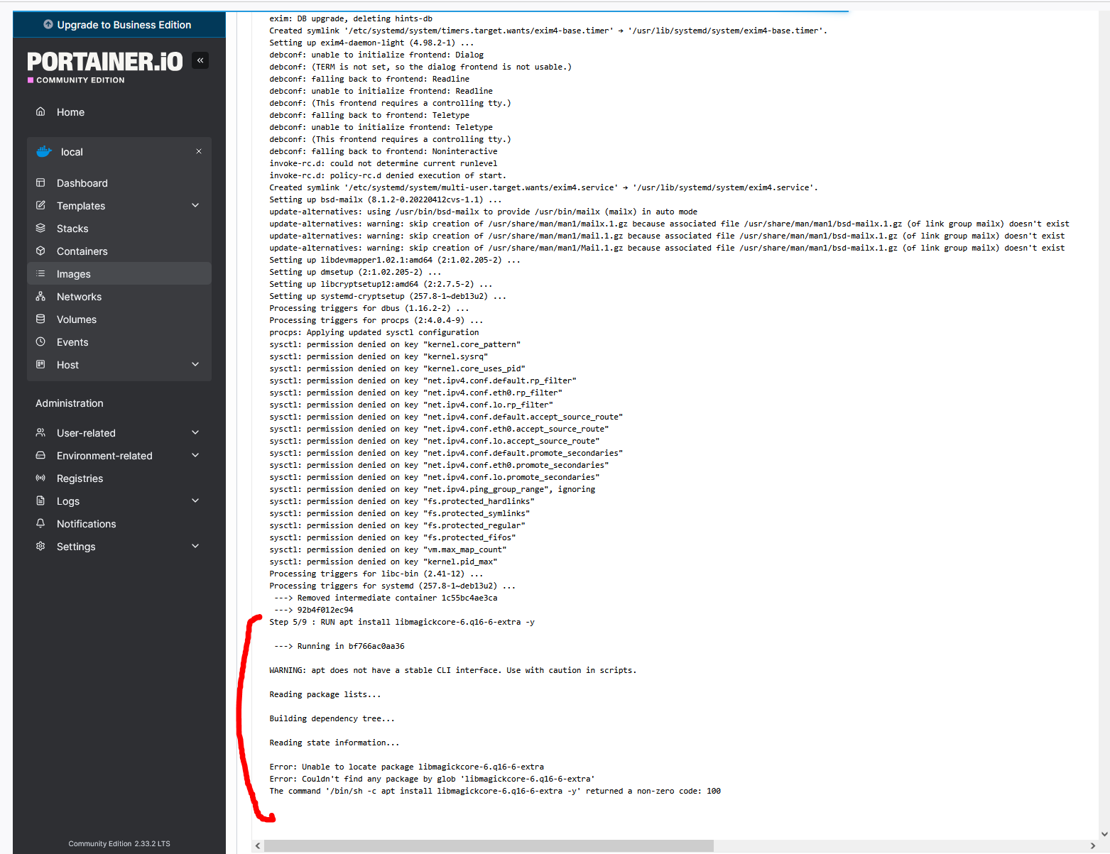 If you are encountering an error saying it can’t install libmagickcore-6.q16-6-extra you need to go into the Dockerfile and change the package to libmagickcore-7.q16-10-extra.