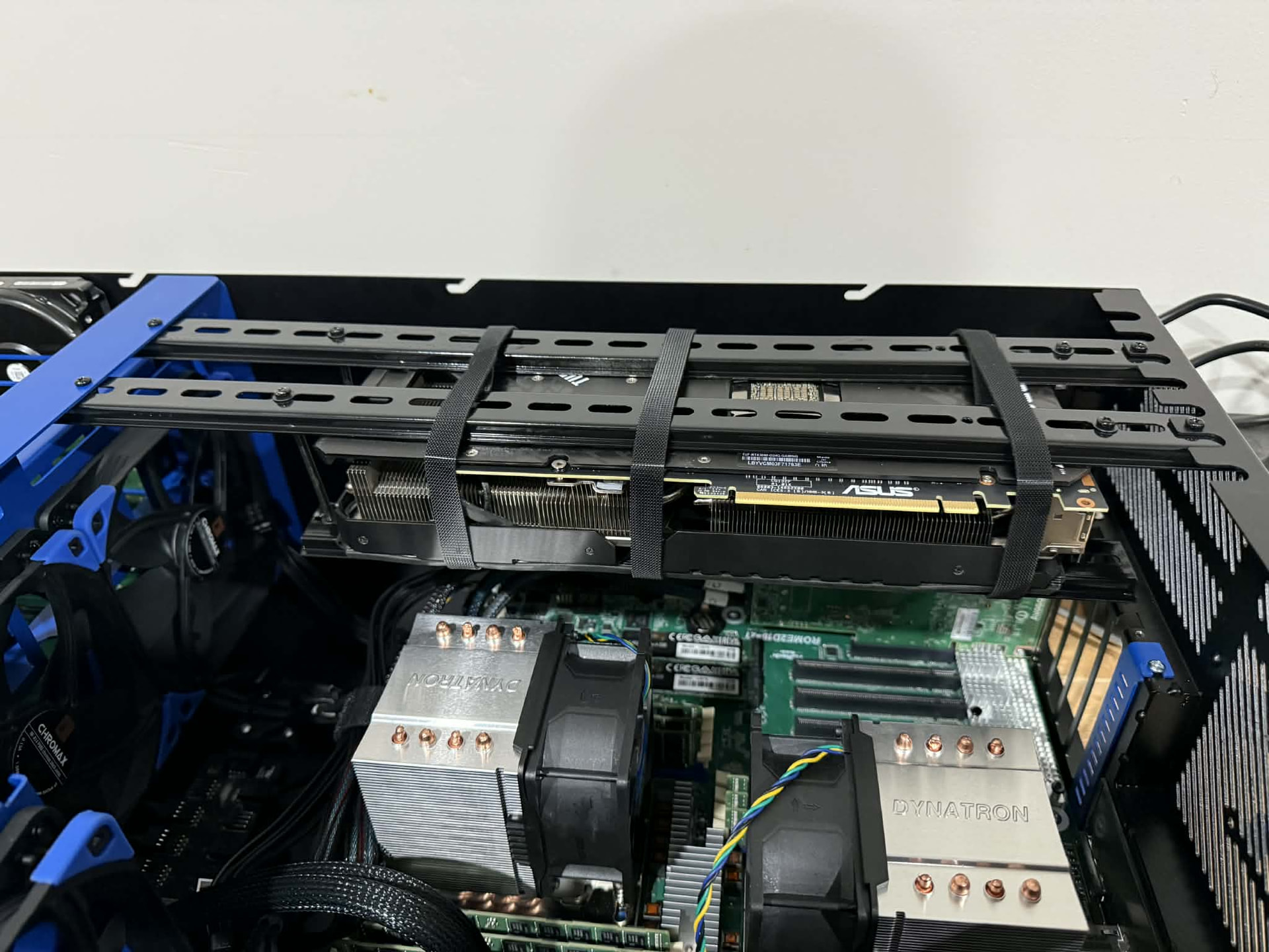 Would be nice to see some kind of way to vertically mount graphics cards. Using my 3090 in the case takes up quite a few PCIe slots that I would like to use for other devices. I have made my own mount that isn’t great, but does the job. I then used a PCIe riser cable to connect the card to the board, saving myself from losing 3 slots to the chunky card.