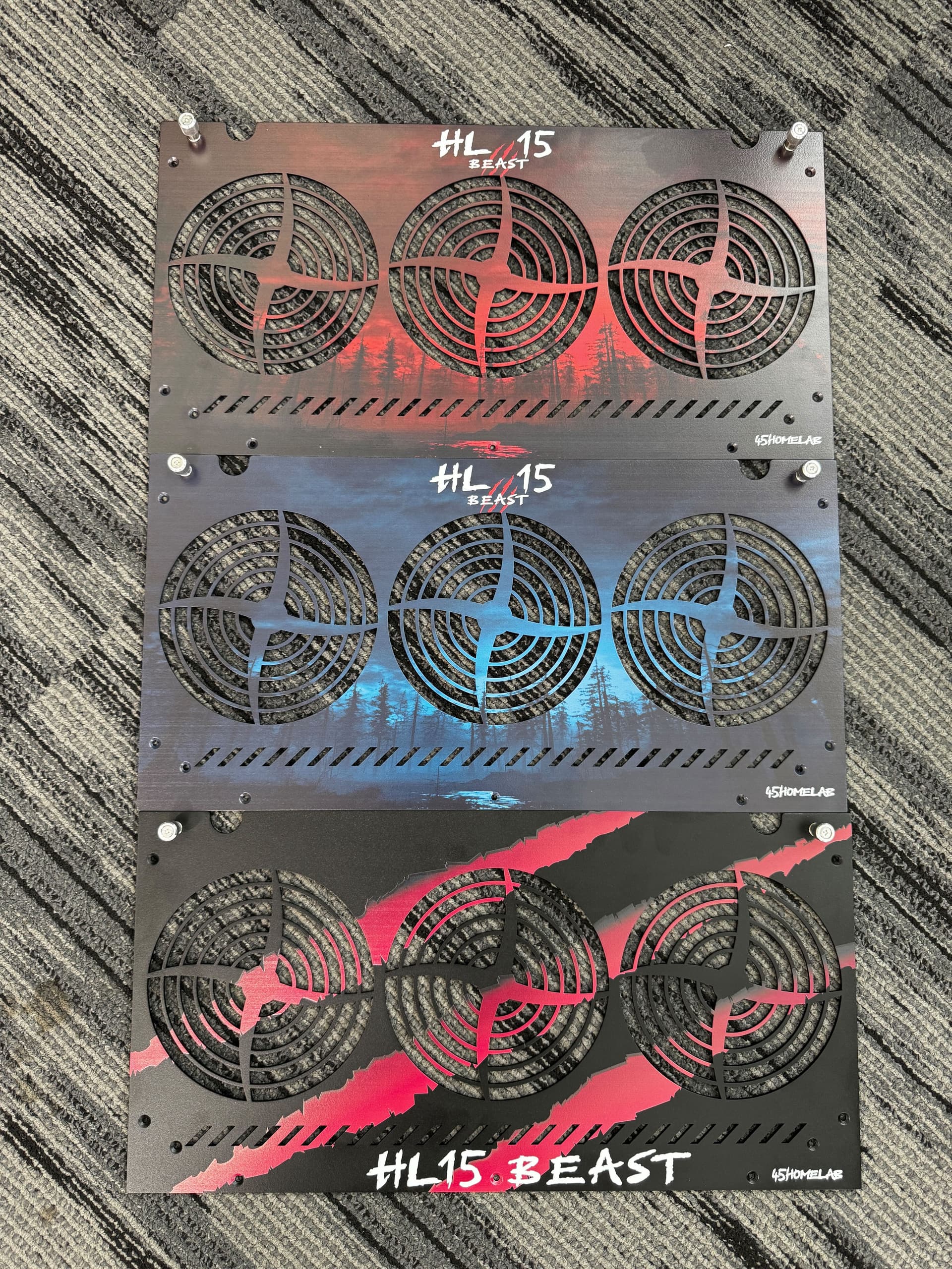 Top two look the best, maybe a white version with the blue and red would look okay as well. Could always have another version with a boring look for those that want a “professional” looking face plate.